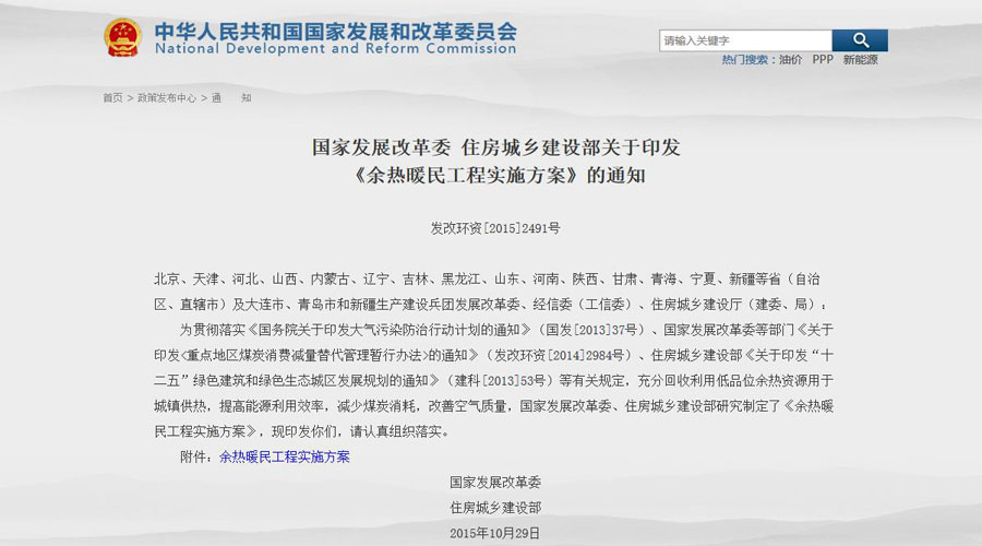 2015年10月29日,國家發(fā)展改革委、住房城鄉(xiāng)建設(shè)部正式發(fā)布《余熱暖民工程實(shí)施方案》此舉意將充分回收利用低品位余熱資源用于城鎮(zhèn)供熱,提高能源利用效率,減少煤炭消耗,改善空氣質(zhì)量真正落到實(shí)處。