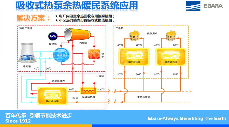 2010年,煙臺(tái)荏原在京能石景山熱電廠實(shí)施了熱泵改造,這是吸收式熱泵在大型抽凝發(fā)電機(jī)組上的**成功應(yīng)用。增加供熱面積200萬平米,采暖季節(jié)約標(biāo)煤約3.4萬噸,減少SO2排放285.6噸/年,減少水損失約21.6萬噸。運(yùn)行穩(wěn)定,節(jié)能、減排效果顯著,拉開了國內(nèi)大型熱電廠熱泵供暖改造的序幕。