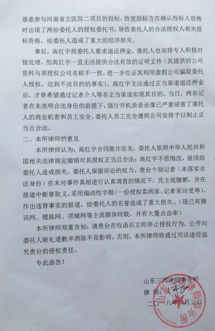 在通過合法渠道無法達(dá)到其目的時(shí),該當(dāng)事人高某便邀約個(gè)別“記者”到我司擔(dān)當(dāng)事務(wù)所無理取鬧,并編排所謂“新聞”,企圖通過“輿論暴力”實(shí)現(xiàn)其不法目的。某電視臺(tái)在未經(jīng)全面了解事實(shí)真相、認(rèn)真審核“新聞”稿件的情況下在網(wǎng)上進(jìn)行了發(fā)布。對(duì)此,我司及時(shí)予以應(yīng)對(duì),已向編發(fā)此“新聞”的電視臺(tái)、當(dāng)事人高某及其所在公司寄送了《律師函》,要求對(duì)方全面了解事實(shí)真相、立即停止侵權(quán)行為、進(jìn)行公開聲明及道歉、及時(shí)消除對(duì)我司的不良影響;否則,我司將通過司法途徑追究相關(guān)方的侵權(quán)責(zé)任。