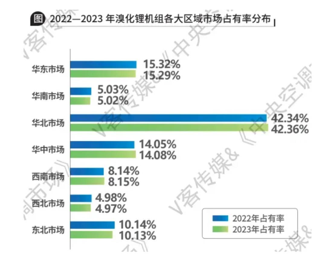 區(qū)域?qū)用?,華北、華東地區(qū)作為我國(guó)以石油和化工為主導(dǎo)的工業(yè)園區(qū)的主要分布地,也是余熱廢熱利用的重點(diǎn)區(qū)域,溴化鋰機(jī)組一直保持著較高的市場(chǎng)占有率。其后市場(chǎng)占有率從高到低依次為華中、東北、西南、華南以及西北地區(qū)。其中,隨著能源開(kāi)發(fā)工作的持續(xù)推進(jìn),溴化鋰機(jī)組在西南區(qū)域的應(yīng)用逐漸增多,市場(chǎng)占有率達(dá)8.15%。