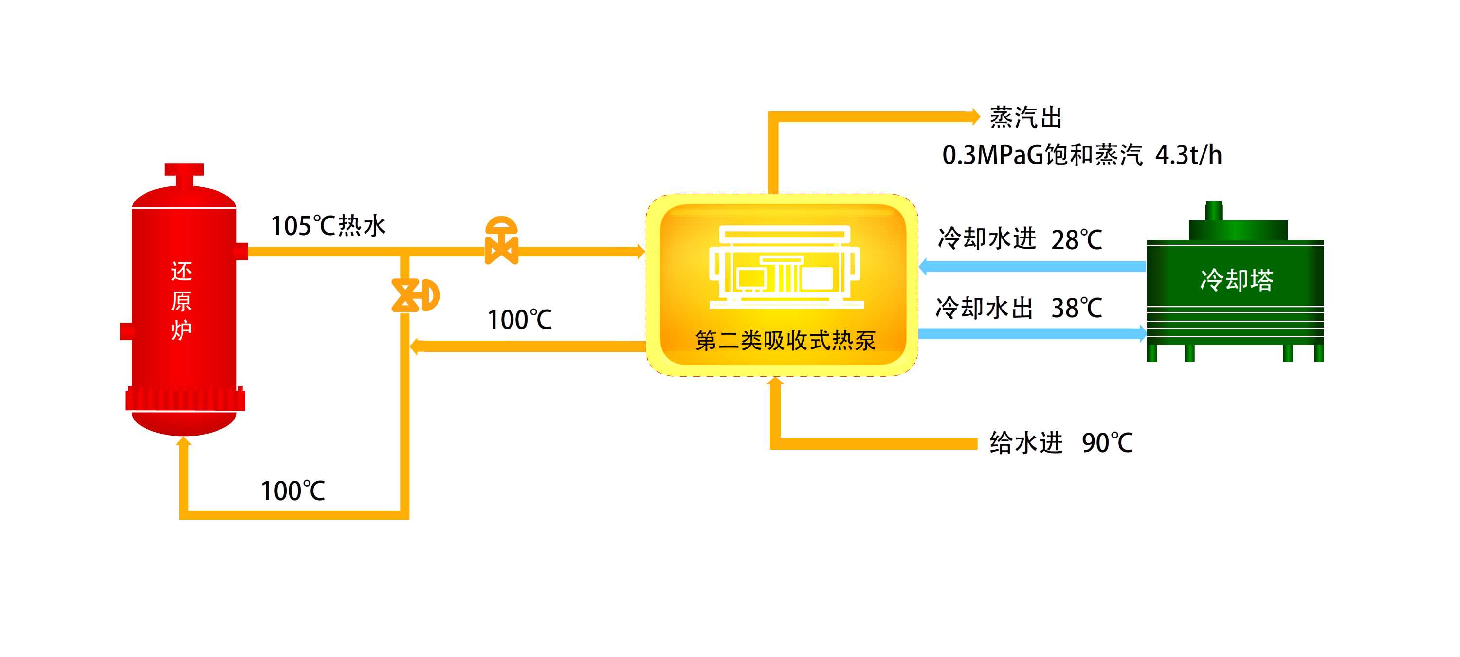 傳統(tǒng)工藝采用空冷器將還原爐底盤105℃熱水降溫到100℃后再回爐循環(huán)使用,應(yīng)用第二類吸收式熱泵后,不僅替代了空冷器,更重要的是能將1O5℃-1OO℃的這部分余熱回收利用直接轉(zhuǎn)換成蒸汽,每小時(shí)可產(chǎn)生O.3MPaG蒸汽4.3噸,供多晶硅制造工藝使用,年節(jié)約標(biāo)煤3000余噸。